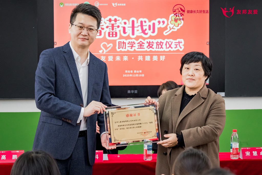 12月10日,友邦人寿保险有限公司河北分公司(以下简称“友邦河北”)携手中国儿童少年基金会(以下简称“中国儿基会”),河北省妇女儿童发展基金会,唐山市及丰润区妇联、教育局等部门在唐山市丰润区左家坞镇大旺庄小学举办“春蕾计划”助学金发放仪式,用于支持河北省230名春蕾女童小学阶段生活补助。