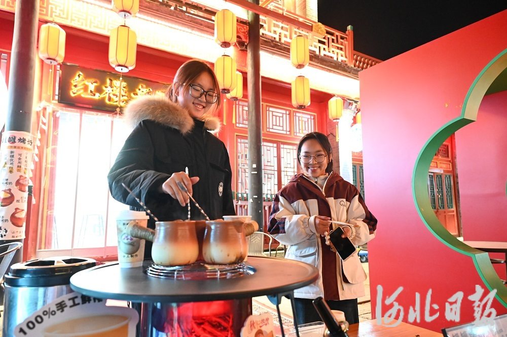 12月13日,石家庄市正定县荣国府景区宁荣街,工作人员(左)正在为顾客制作罐罐烤奶茶。河北日报记者张晓超摄