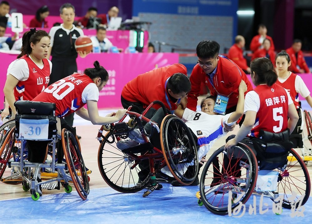 12月13日,河北运动员李伟娇在轮椅篮球比赛中不慎摔倒,山东运动员与工作人员一起将其扶起。