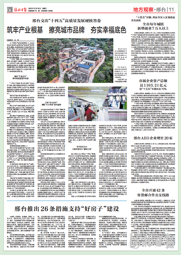 “十四五”期间,邢台市持续唱响“解放思想、奋发进取”主旋律,大力实施“工业立市、文化兴市”战略,连续两年入选全国先进制造业百强市,成功跻身全国地级市城市品牌百强,获评国家居家和社区基本养老服务提升行动试点市,以过硬实绩交出了一份高质量发展答卷。