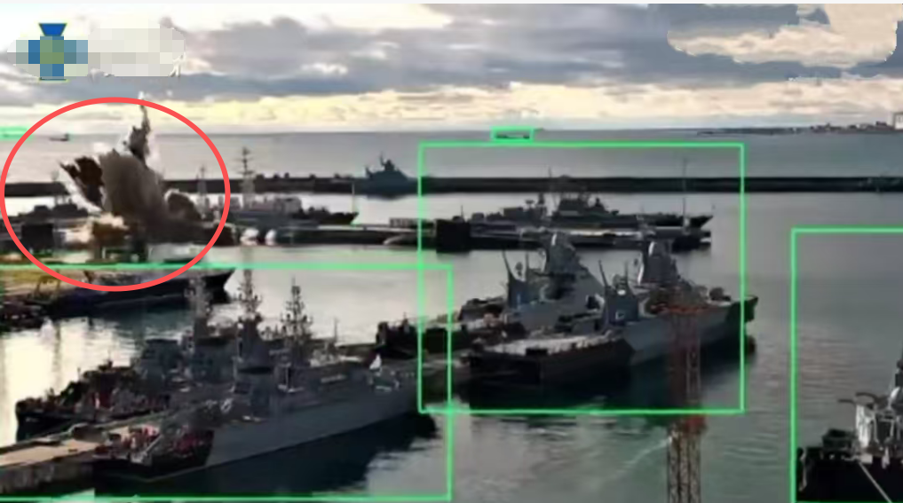 为了证明这次行动战绩,乌方公布了此次新罗西斯克港的监控画面。画面显示,港口内至少停泊了多艘水面舰艇和潜艇,其中包括2艘22800型导弹舰艇、2艘636.3型潜艇和一艘21600型巡逻舰。爆炸发生在最内侧停泊的潜艇后方。