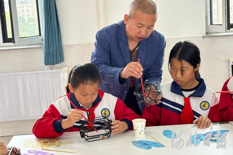 图为王达在学校向小学生传授制作工艺。吴海民摄