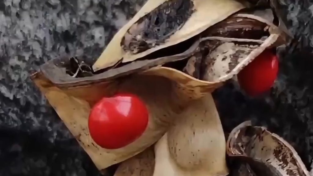 郭沫若先生认为,王维诗中的红豆指的是海红豆,是落叶小乔木,常见于岭南地区,开白色或淡黄色小花,种子是鲜红的心形,坚硬如宝石,恰似一颗跳动的心脏,被称“心心相印”,恰如坚贞的爱情,历久弥坚。但是,海红豆有毒,千万不能吃!