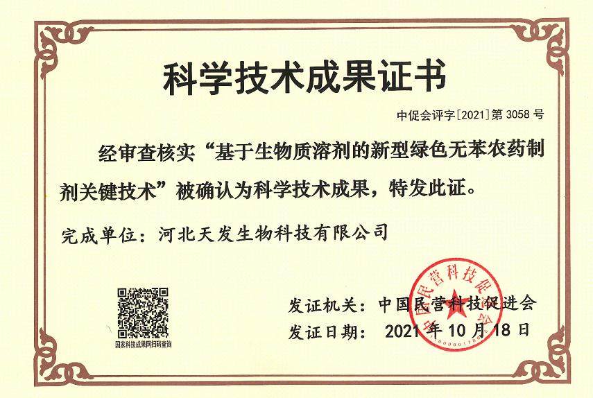2014年天发生物创立之初,段文岗始终以“农作物增产增收、农民丰收致富”为己任,致力于将公司打造成环保农药品牌,聚焦农业领域“卡脖子”问题布局科学研究方向,紧跟世界发展步伐。公司先后与河北农业大学、天津大学等多所高校深入合作打造企业技术创新平台。开发出基于生物质溶剂的新型绿色无苯农药制剂关键技术,并将其应用于规模化生产,实现了农药制剂产品升级换代。公司先后取得发明及实用新型专利二十余项,联合申报国家级重点研发项目2项,申报省级重点研发项目5项,参加3项农药行业团体标准制定工作。2021年公司完成的“基于生物质溶剂的新型绿色无苯农药制剂关键技术”项目通过科技成果评价会,其科技水平为国际先进,同年公司被列为“全国生态环保优质农业投入品生产试点”。