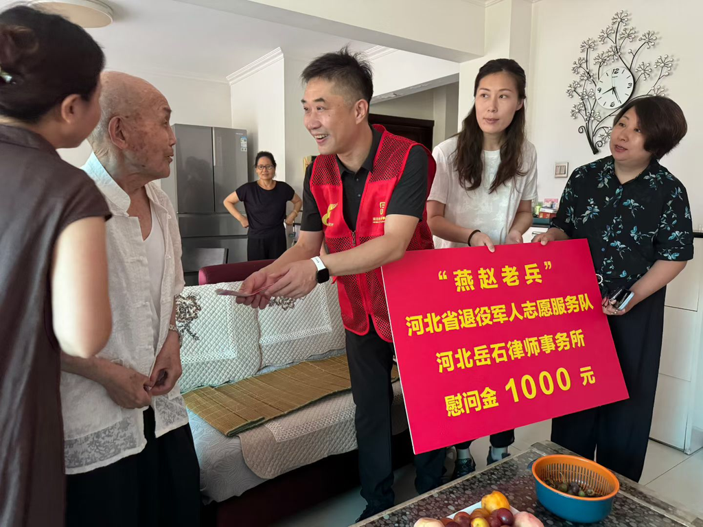 岳鹏(穿红色马甲)为百岁抗日战争老英雄送去慰问金和慰问品。