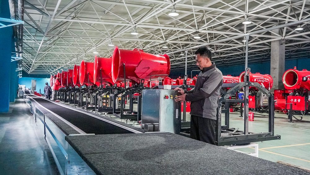 12月14日,在位于张家口市宣化冰雪产业园的卡宾滑雪装备制造有限公司厂区,一台台崭新的造雪机整齐排列,正在进行出厂前的最后检测。