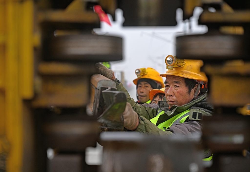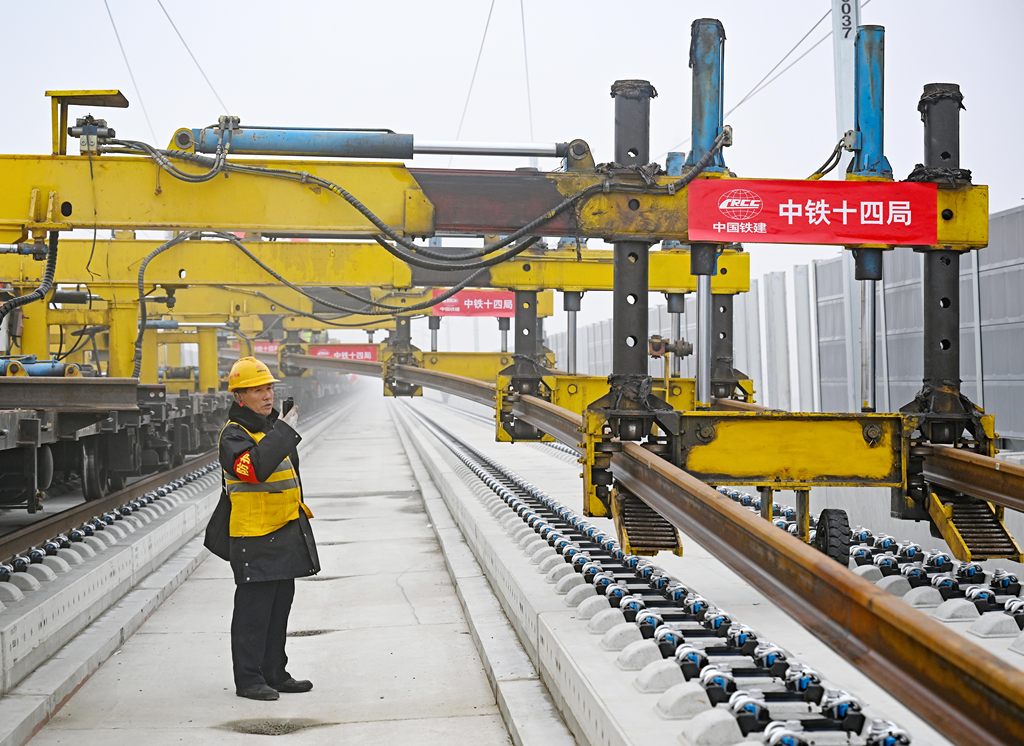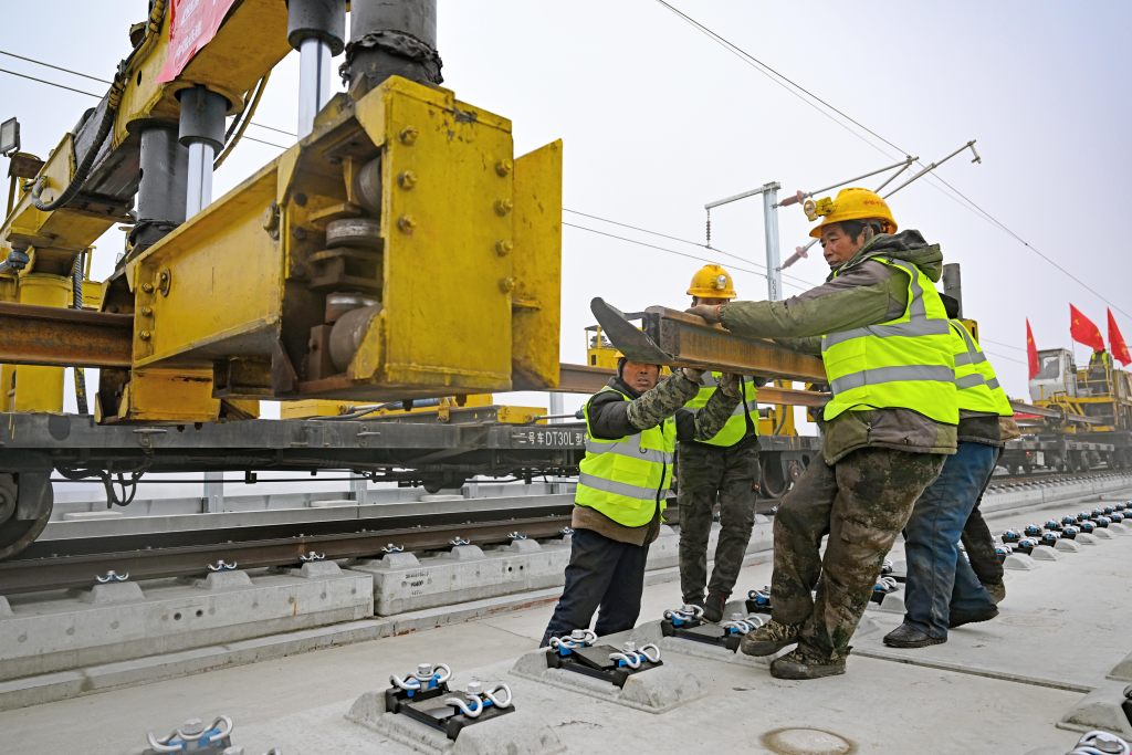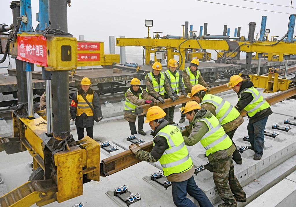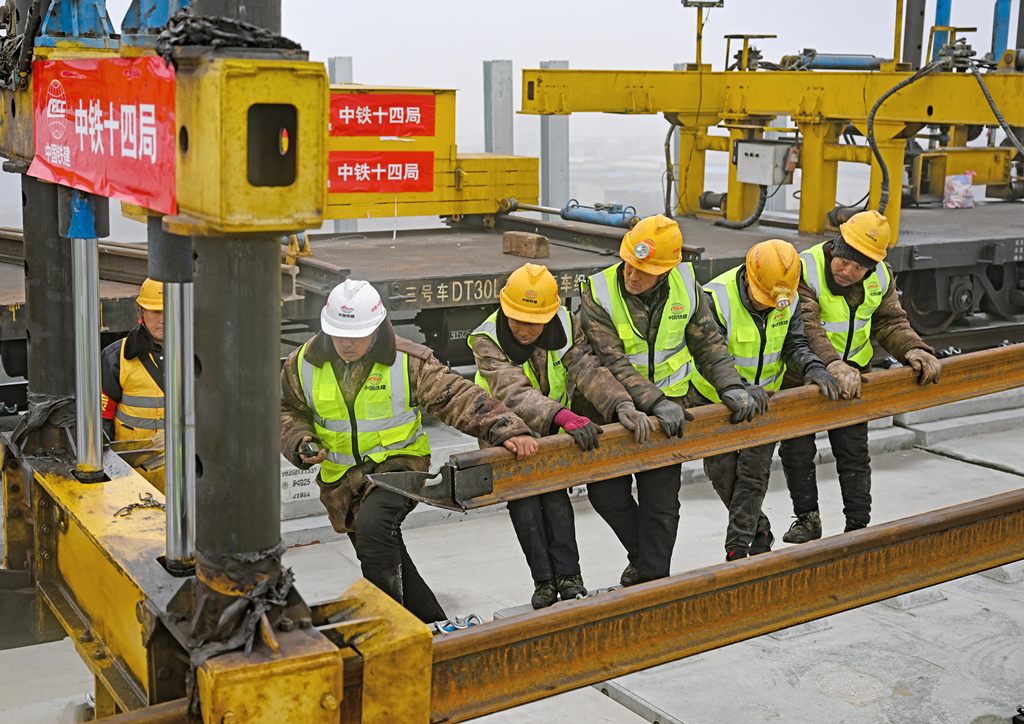 12月19日,中铁十四局建设者在京港高铁雄商段进行铺轨施工。