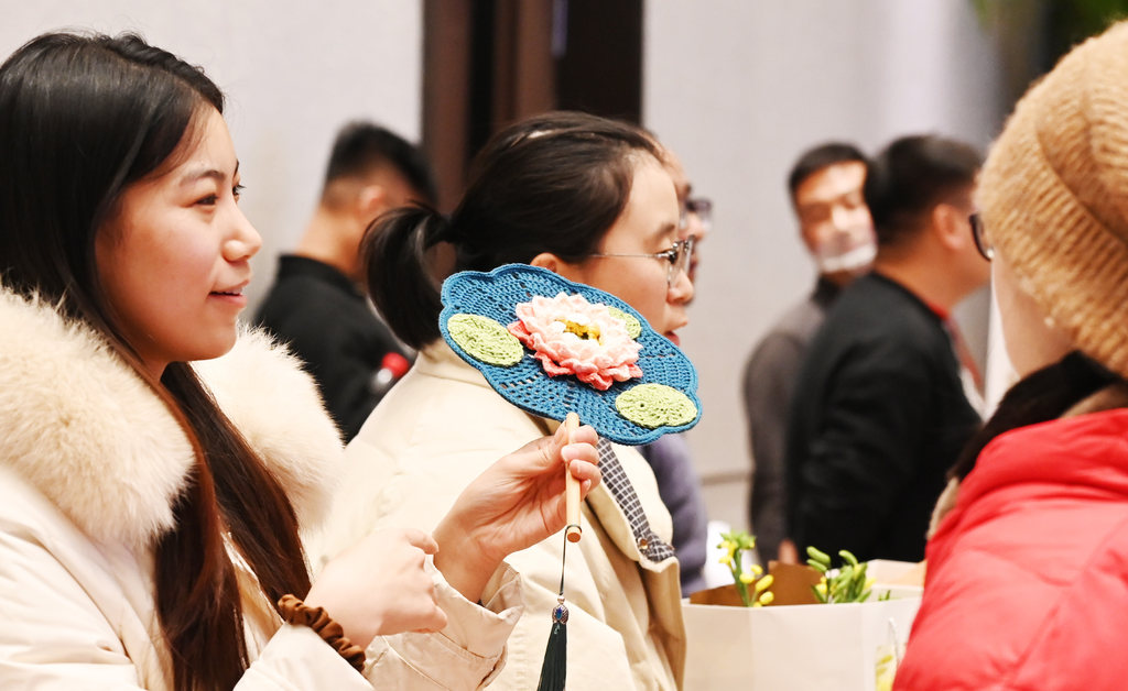 12月18日,雄安新区第一届“雄安蒲艺师”劳务品牌职业技能大赛暨“创富工坊”产品推介上,工作人员(左一)正向参观者展示“创富工坊”产品。河北日报记者 刘光昱 摄
