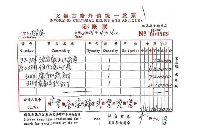 南京博物院称,这件《江南春》图卷被相关鉴定人员认定为“伪作”“不宜入藏”之后,1997年4月15日,该院向原江苏省文化厅提交报告,请求“将不够馆藏标准的文物(即博物馆的处理品)进行调剂,价拨给省文物总店处理”。原江苏省文化厅于1997年4月21日同意调剂。1997年5月8日,被专家认定为赝品的《江南春》图卷拨交给原江苏省文物总店,并于2001年4月16日被买走。在发票记账联上,买方姓名登记为“顾客”,商品名称登记为“仿仇英山水卷”,单价6800元。该“顾客”同时还购买了其他3件书画作品,合计17420元。
