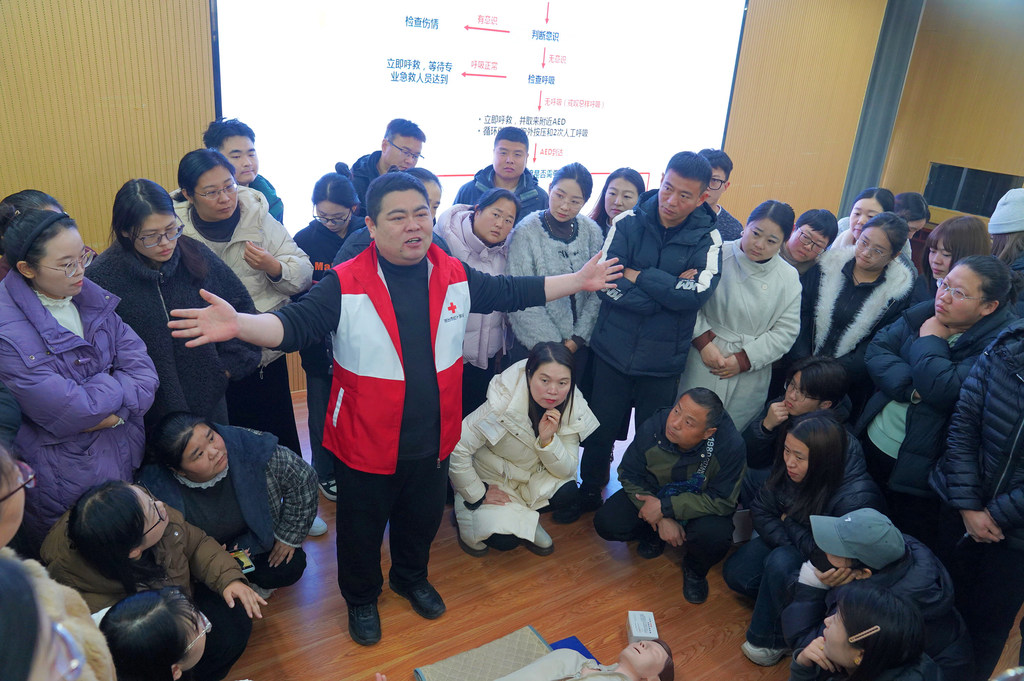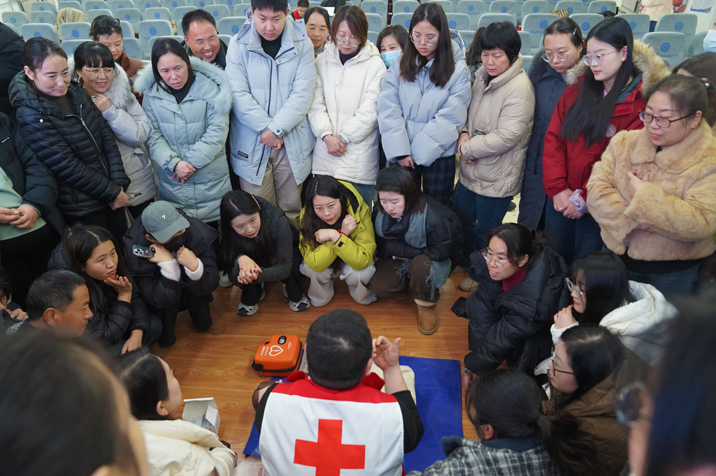 12月18日,邢台经济开发区红十字会工作人员在为参加救护培训的教师讲解急救知识。