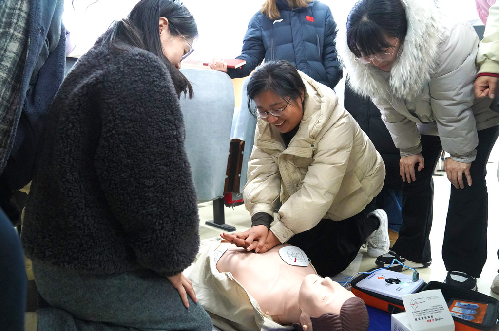 12月18日,邢台经济开发区参加救护培训的教师在进行心肺复苏实操。
