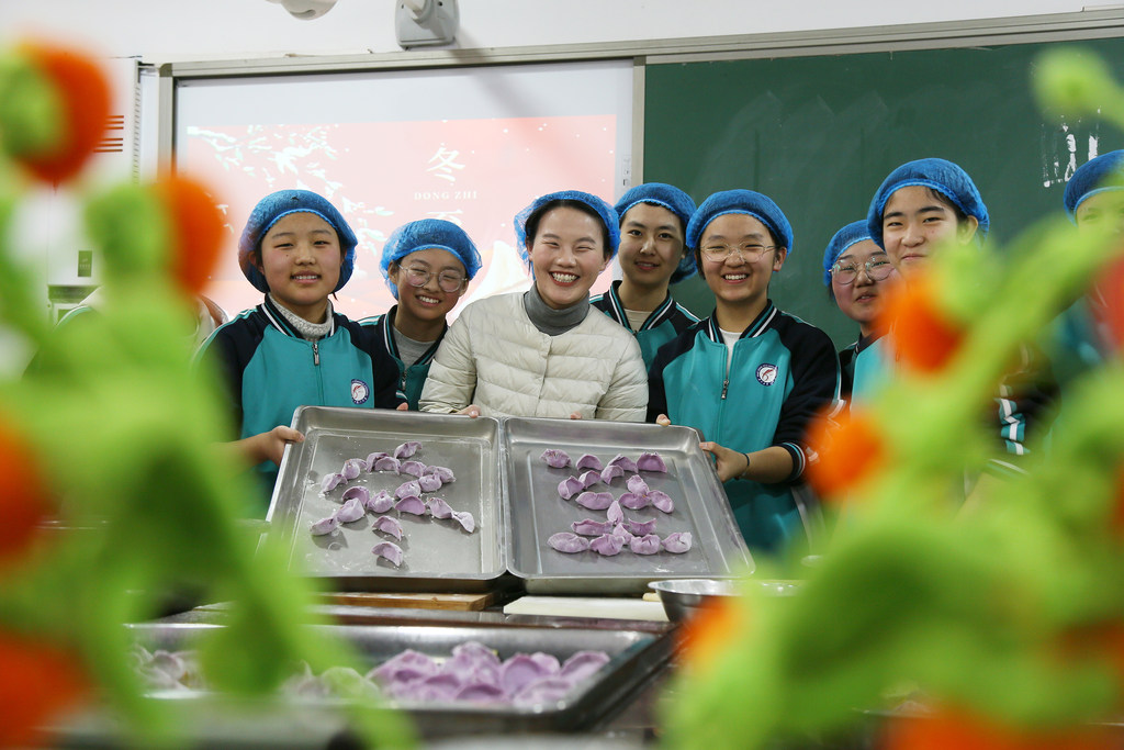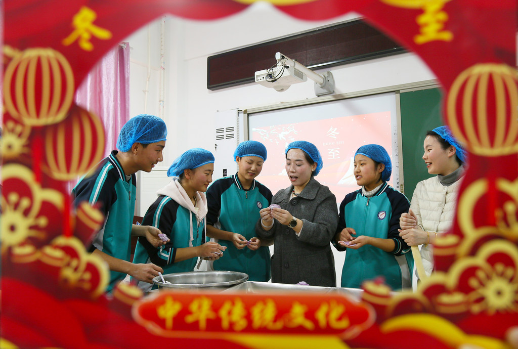 12月18日,平乡县第六中学的师生包饺子迎冬至。
