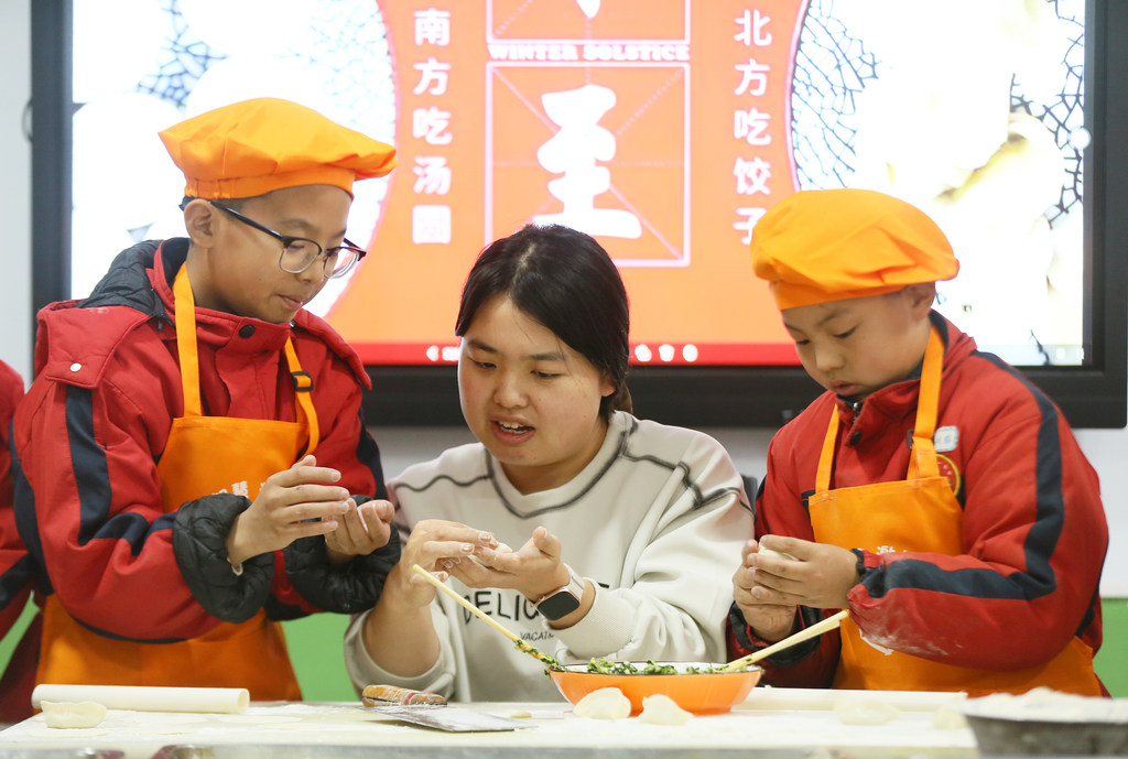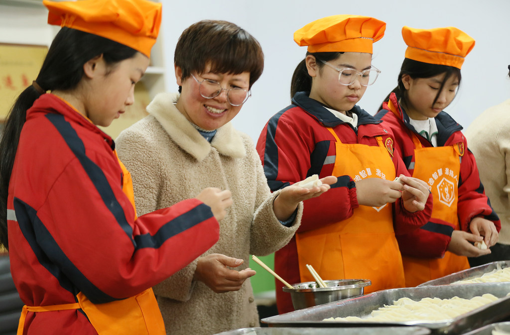 12月18日,平乡县第六中学的老师在指导学生包饺子。