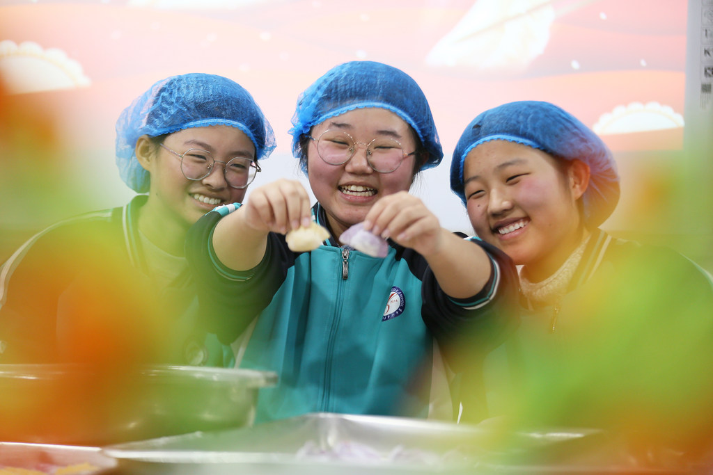12月18日,平乡县第六中学的学生在展示包好的饺子。