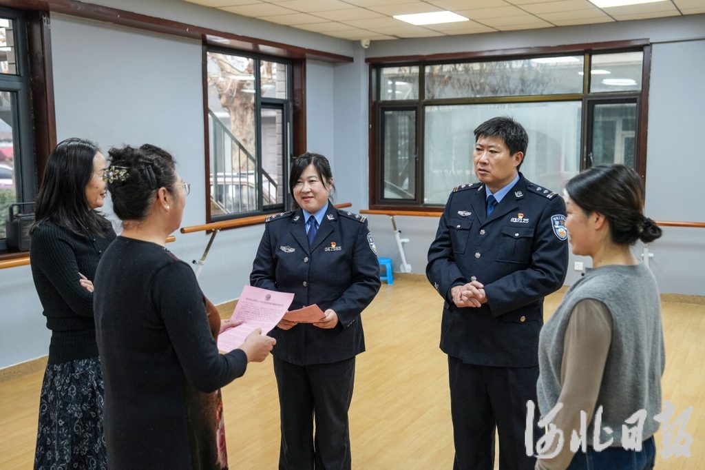 12月18日,冉晓菲(左三)与丈夫樊鹏为社区居民讲解防范电信网络诈骗知识。 河北日报记者 许佳奇摄