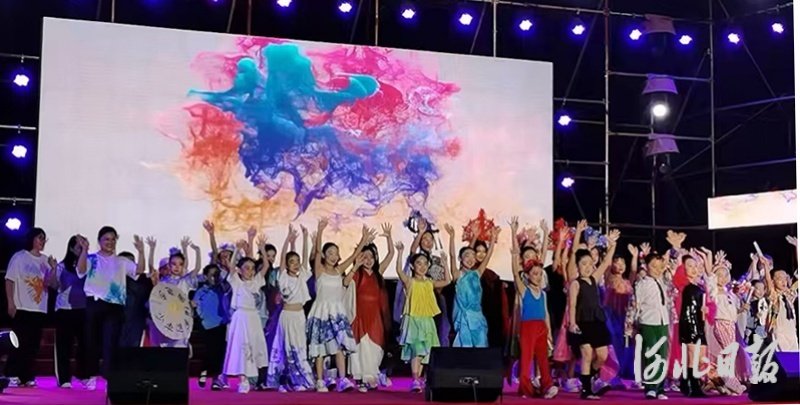 图为孩子们身着扎染服装在舞台上展现自我。