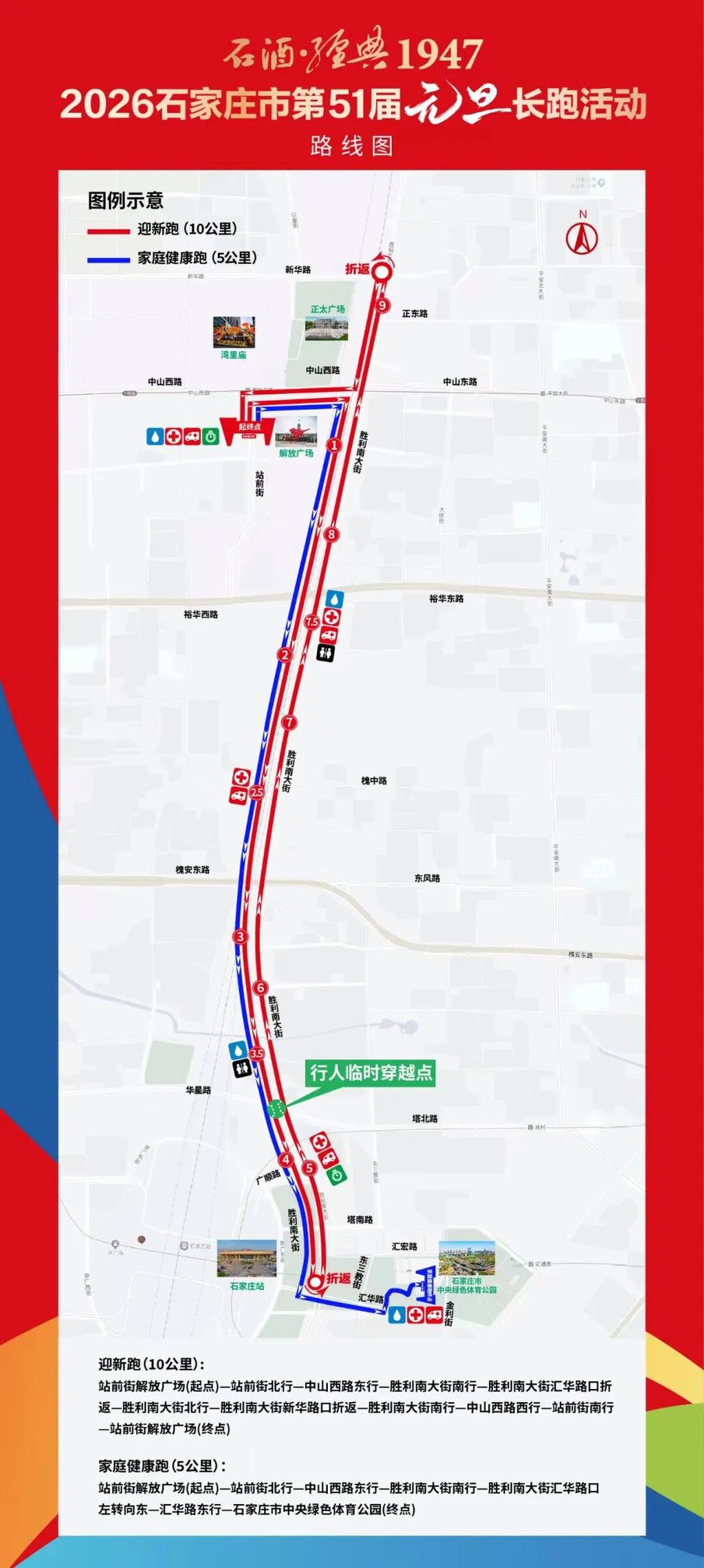 2026石家庄市第51届元旦长跑活动,将于2026年1月1日07:30(星期四)在站前街解放广场举行。为保障活动顺利进行,确保交通安全畅通,根据《中华人民共和国道路交通安全法》第三十九条规定,石家庄市公安局交通管理局决定在活动期间对相关道路实施分时、分段交通管制。现将活动全程交通管理措施予以通告如下: