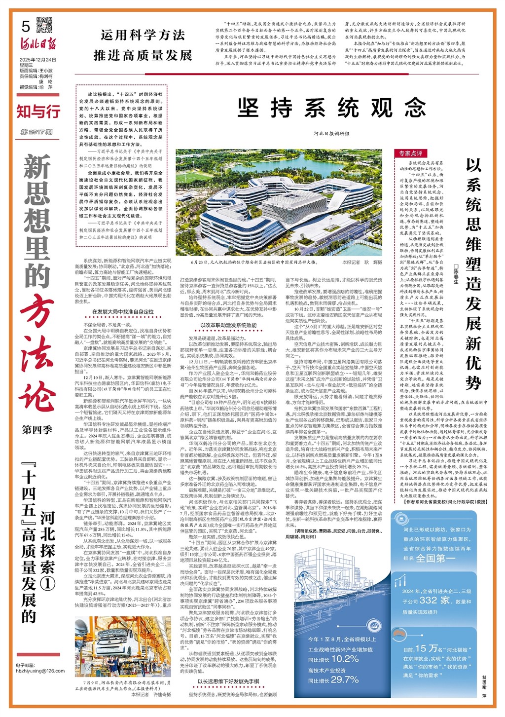 “十五五”时期是基本实现社会主义现代化夯实基础、全面发力的关键时期,也是河北高质量发展的关键五年。我省既面临京津冀协同发展纵深推进、雄安新区建设全面提速等重大机遇,也需应对创新能力不强、资源环境约束突出等挑战。越是关键时期,越需要坚持系统观念、强化系统思维,以整体性、关联性、协同性的视角破解发展中的矛盾问题,在系统谋划中塑造发展新优势。