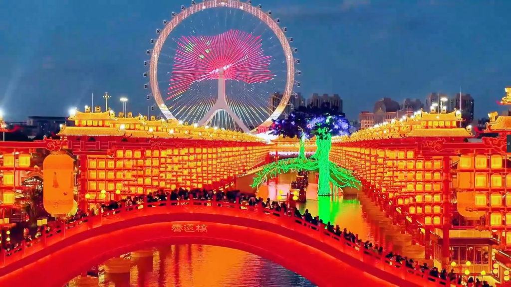 游船行至桥下,一座水上摩天轮跃入眼帘。斑斓夜色中,这座被誉为“唐山之光”的摩天轮,与海河畔的“天津之眼”遥相呼应。“眼前这条运河曾是连接唐山与天津的人工运煤水道,”河头老街景区行政服务部赵凯介绍,“在岁月的长河里,河头老街不仅输送过唐山的煤炭资源,还承载着三地绵延不绝的交往交流交融史。”