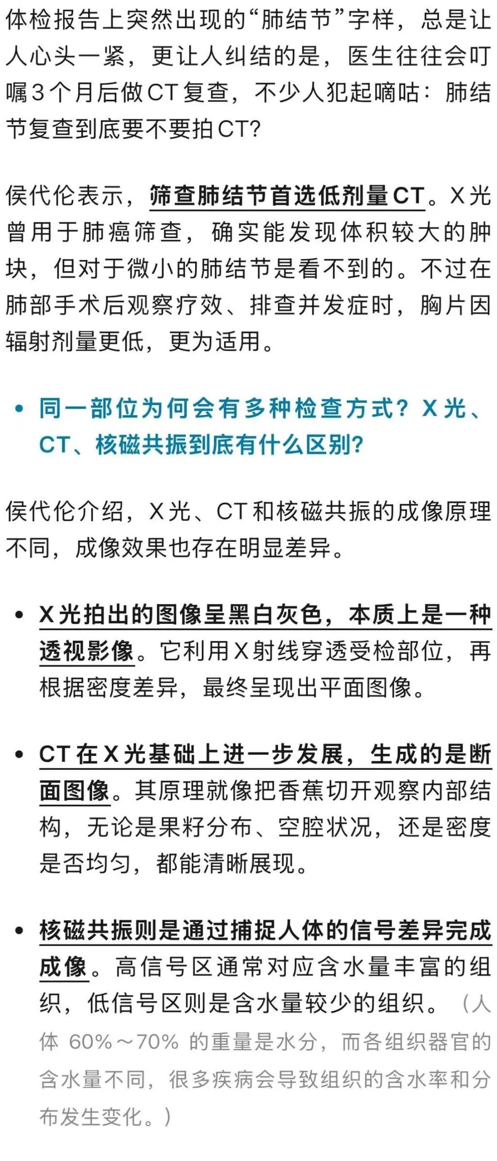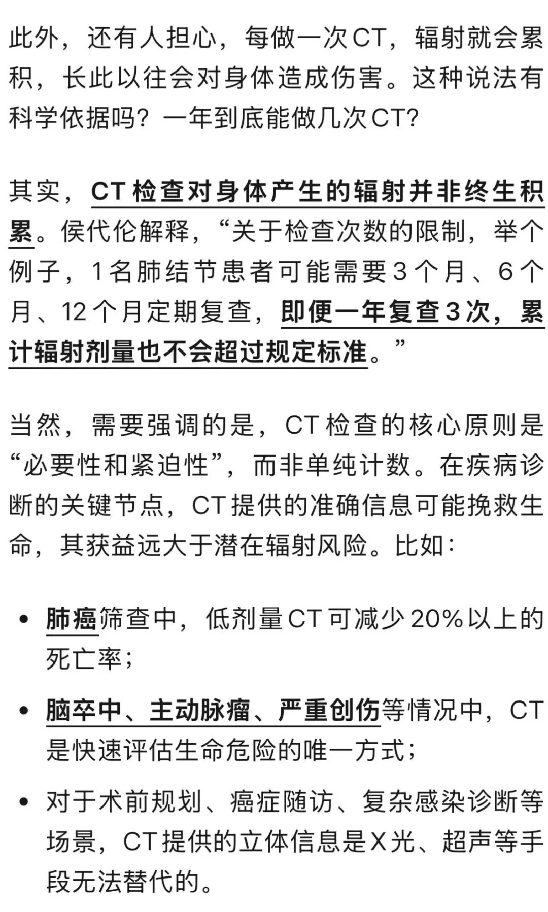 侯代伦解释,X射线(CT是一种利用X射线进行断层成像的技术)辐射对人体的致癌作用已经非常明确,但这并不意味着做CT就会致癌,只要接受的总辐射量在安全范围内,即可视为安全,基本不会对人体造成额外伤害。