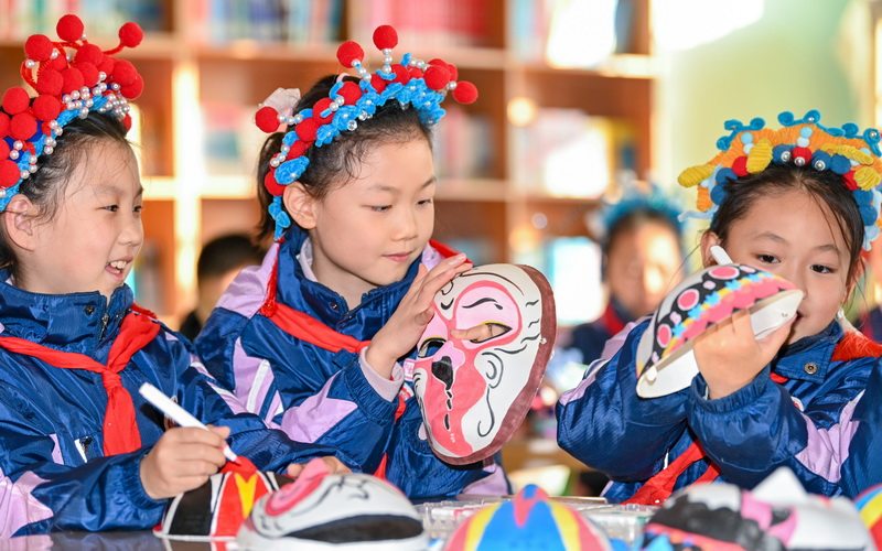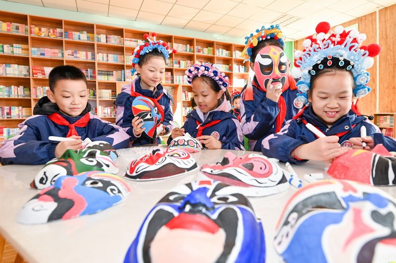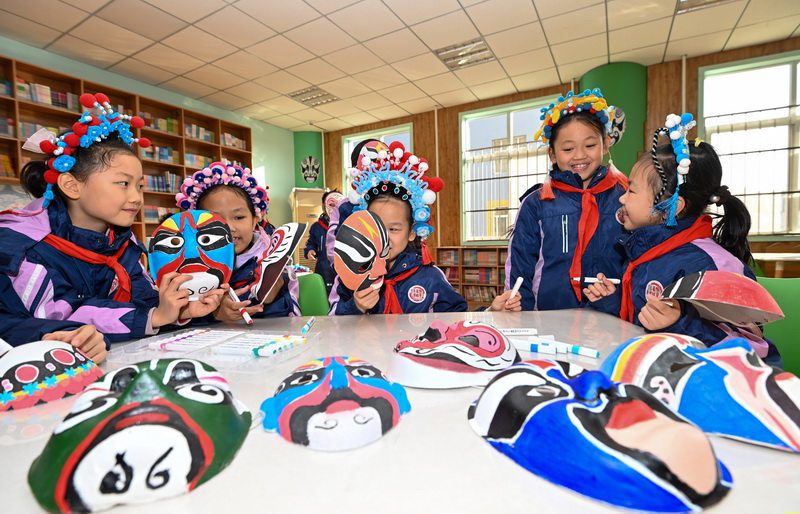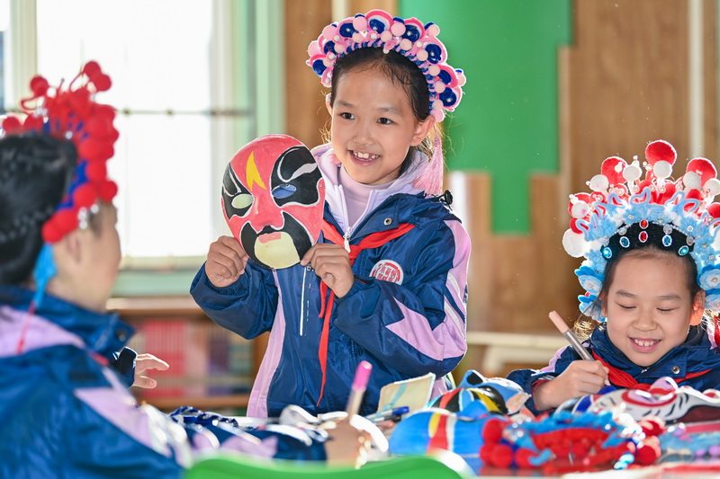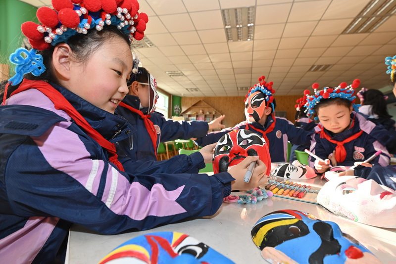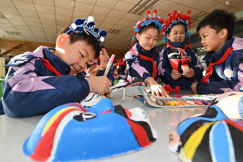 12月24日,石家庄市裕华西路小学学生在绘制戏曲脸谱。