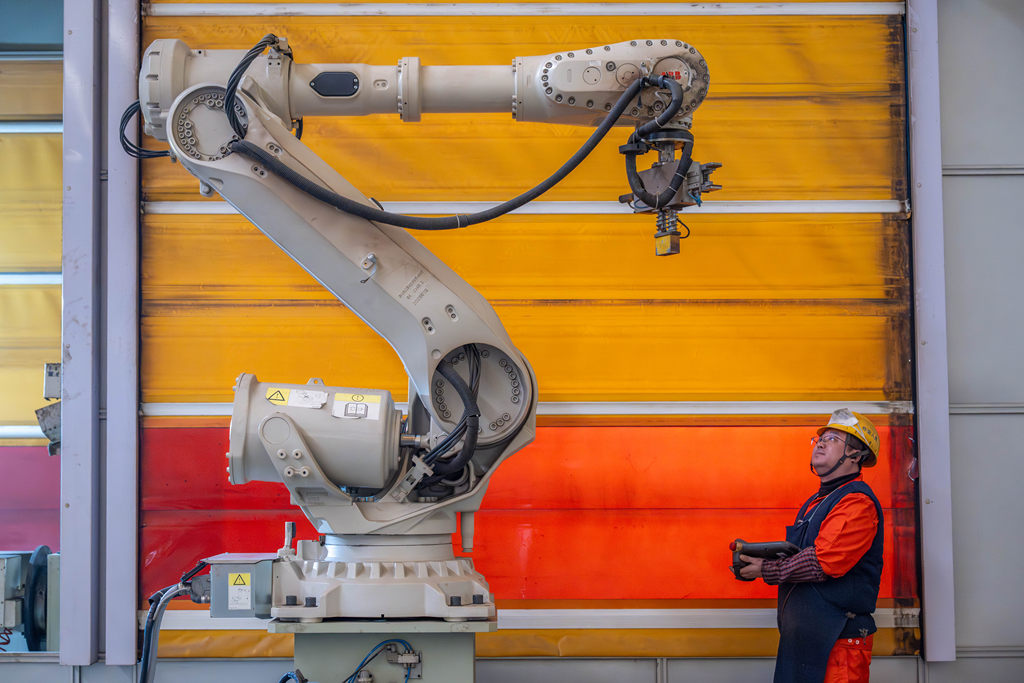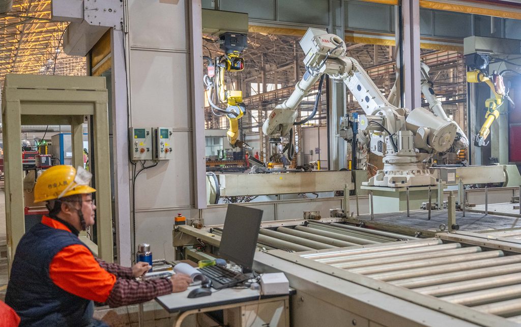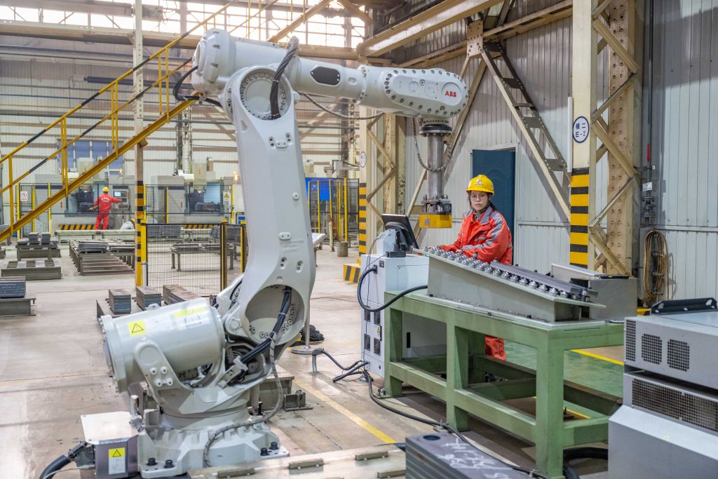 12月25日,位于秦皇岛市山海关区的中铁山桥集团有限公司生产车间,工人在巡查作业机器人。