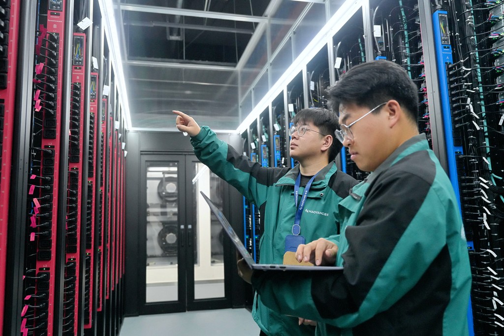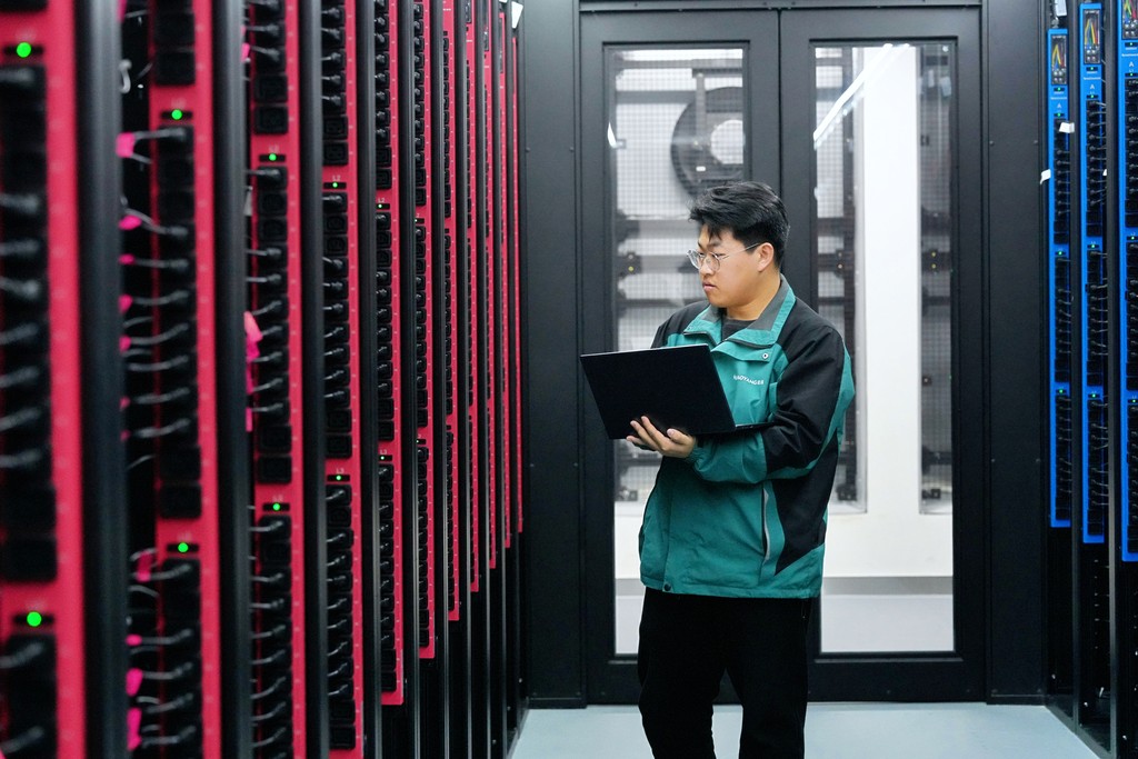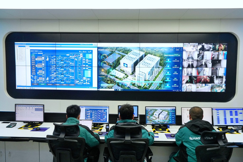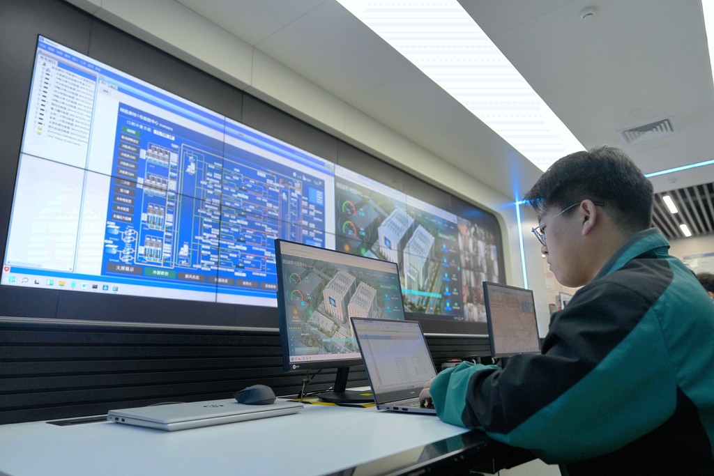 12月11日,固安县皓扬廊坊1号数据中心工作人员在监测设备运行情况。