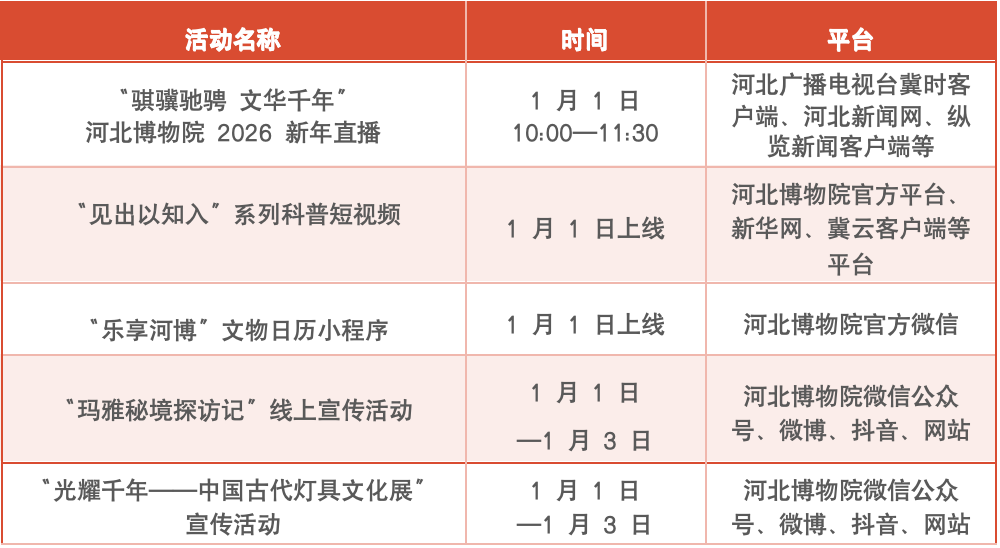 河北日报客户端讯(记者史晓多)近日,记者从河北博物院获悉,2026年元旦期间,河北博物院精心策划5大贺岁新展,16个线下展览与40余个线上云展览同步开放。同时推出8大主题文化活动、文创惠民活动和智能互动体验项目,通过深度挖掘文化内涵,创新打造沉浸式互动场景,为观众构建多元化、高品质的文博体验空间。