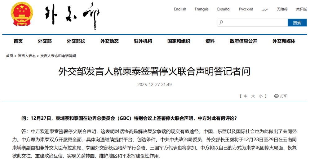 问:12月27日,柬埔寨和泰国在边界总委员会(GBC)特别会议上签署停火联合声明,中方对此有何评论?