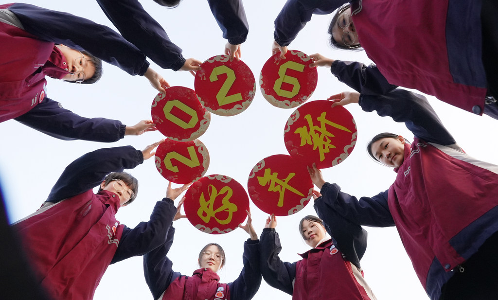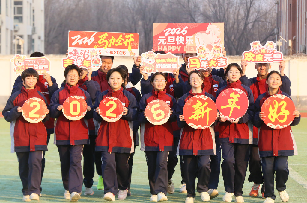 12月24日,平乡县第二中学学生手持“2026新年好”等字样喜迎新年。