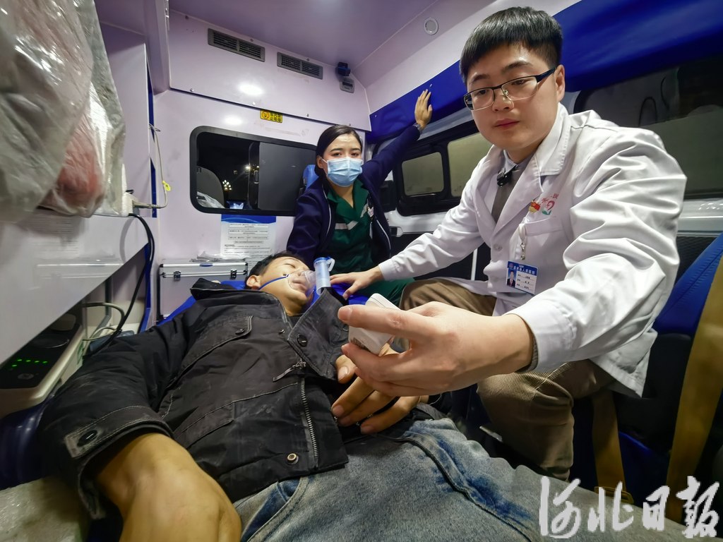 吕霖潇(右一)在且末县人民医院的急救车上为患者治疗。