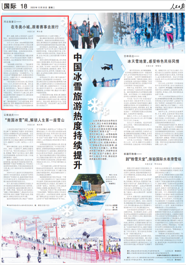 从因冬奥而走向世界的河北崇礼,到让东南亚游客邂逅人生第一场雪的云南迪庆;从吉林延边的雾凇奇景到新疆阿勒泰的“粉雪天堂”……广袤的中国大地上,冰雪画卷绚丽多姿,吸引越来越多外国游客。他们或驰骋雪道之上,或徜徉群山之间,或漫步街巷之中,领略冰雪运动的激情,感受冰雪文化的魅力。冰雪旅游热度不断提升,持续带动消费升级,促进产业融合,是中国扩大高水平开放、推动经济高质量发展的缩影。