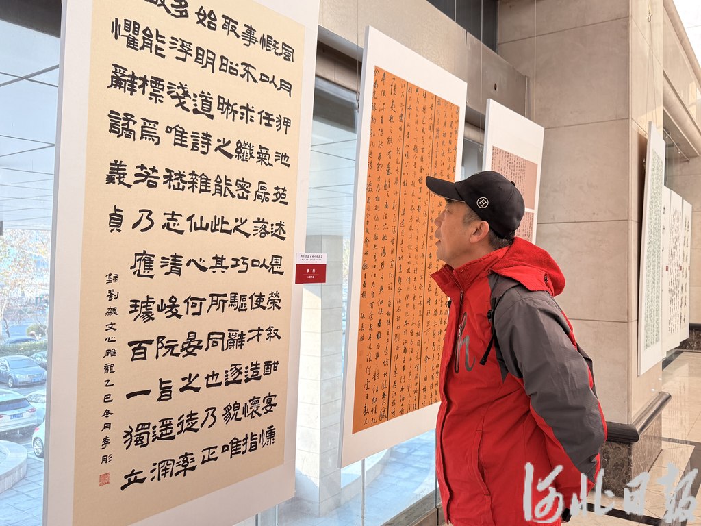 12月30日,石家庄市长安区“翰墨书盛世时代谱新篇”迎新年书法作品展,书法爱好者正在欣赏作品。河北日报客户端见习记者侯淼摄