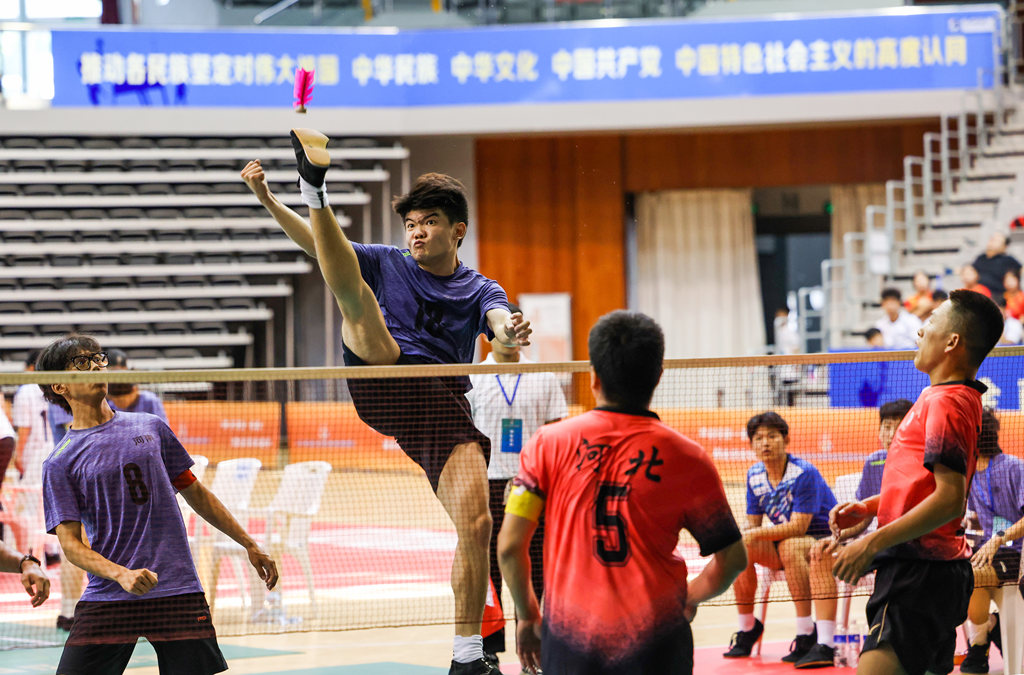 男子三人赛决胜局将全场气氛推向高潮。河南队与山东队展开激烈角逐,双方比分交替上升,关键时刻,河南队主攻手以一记贴网“双飞”完成绝杀,毽球划出优美弧线应声落地,赢得阵阵掌声。