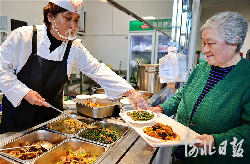 12月25日,居民在秦皇岛市海港区万和城社区的颐港湾居家养老服务中心社区食堂打饭。河北日报、河北日报客户端记者孙也达摄