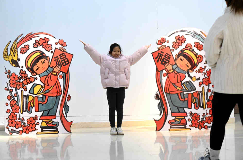 ↑12月27日,一名小朋友在石家庄市美术馆“生生复象”年画艺术展上留影。