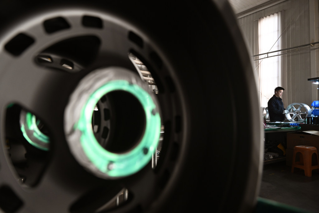 2025年12月30日,位于威县高新区的河北智毂汽车科技有限公司,工人在检测汽车轮毂产品。
