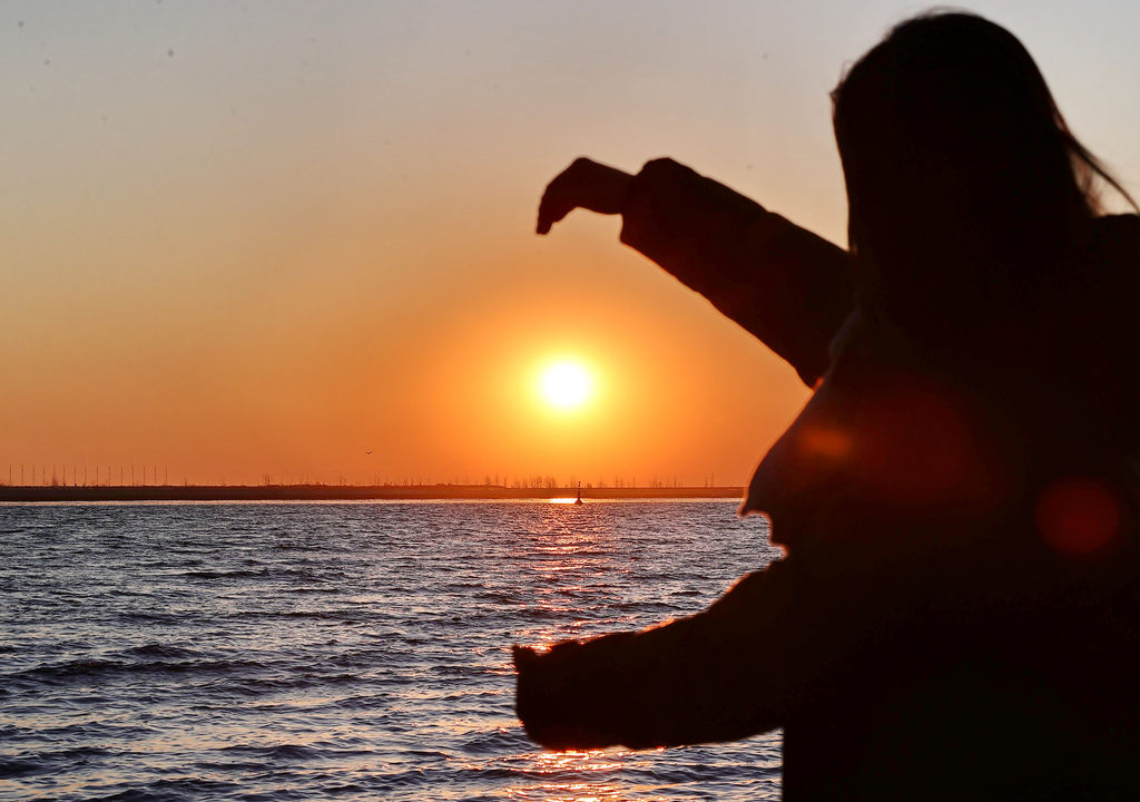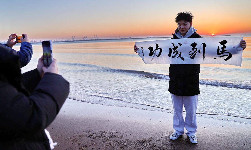 2026年1月1日,秦皇岛市海港区金梦海湾海滩,市民伴着朝阳合影留念。