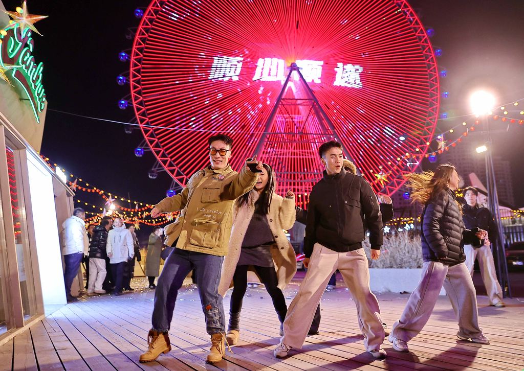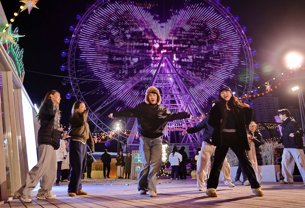 2026年1月1日,游客在秦皇岛市海港区的秦皇之眼摩天轮前跳舞。