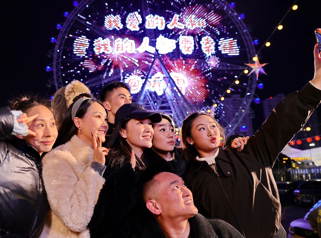 2026年1月1日,游客在秦皇岛市海港区的秦皇之眼摩天轮前自拍合影。
