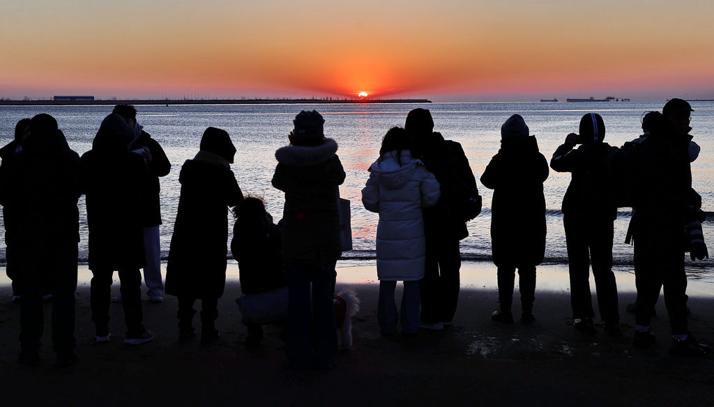2026年1月1日,秦皇岛市海港区金梦海湾海滩,市民正在观看日出。