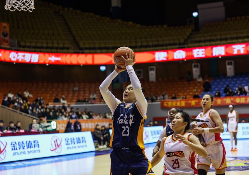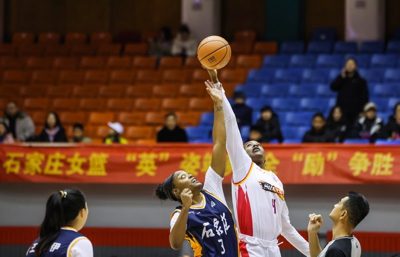 2025年12月31日,石家庄英励3号外援戴维斯(左二)在比赛中跳球。