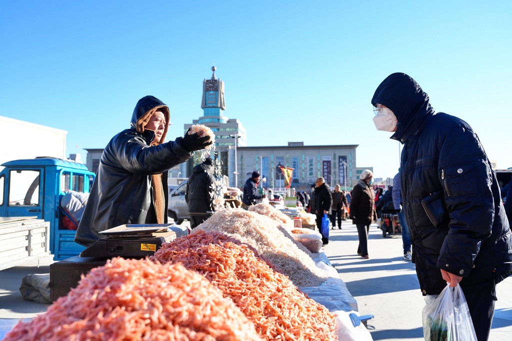 2025年12月31日,在廊坊市广阳区财富市集开办的便民大集,商户(左)为顾客展示虾皮。
