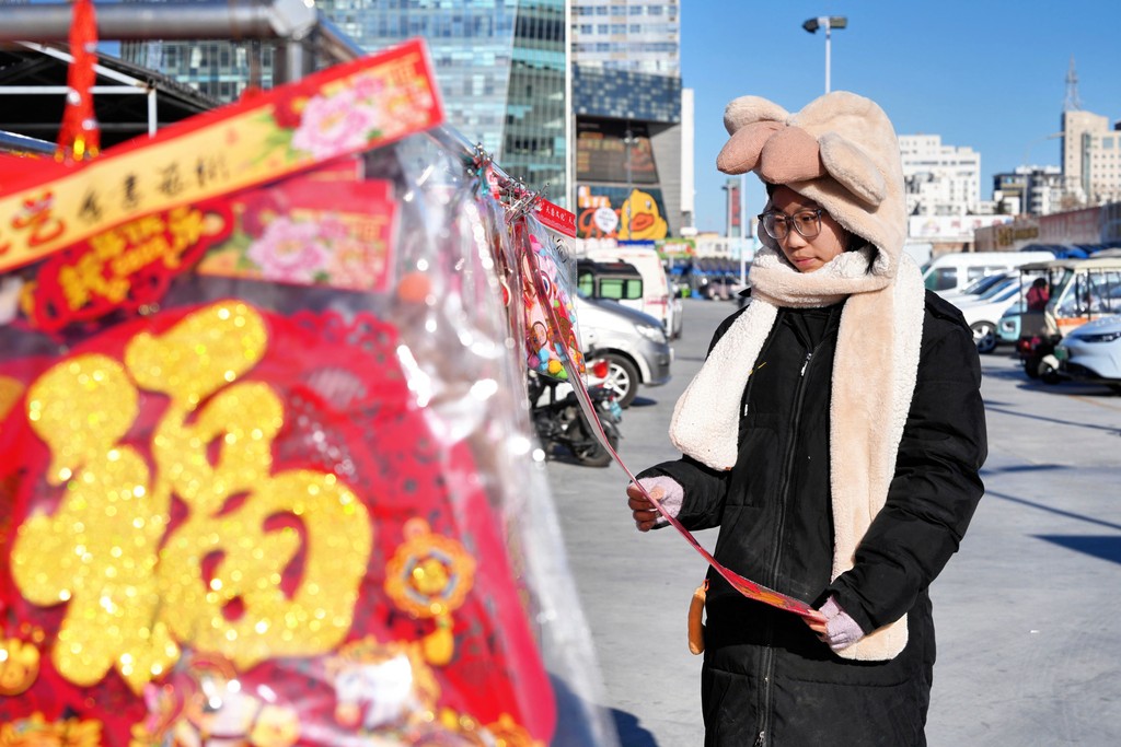 2025年12月31日,市民在廊坊市广阳区财富市集开办的便民大集上选购对联。