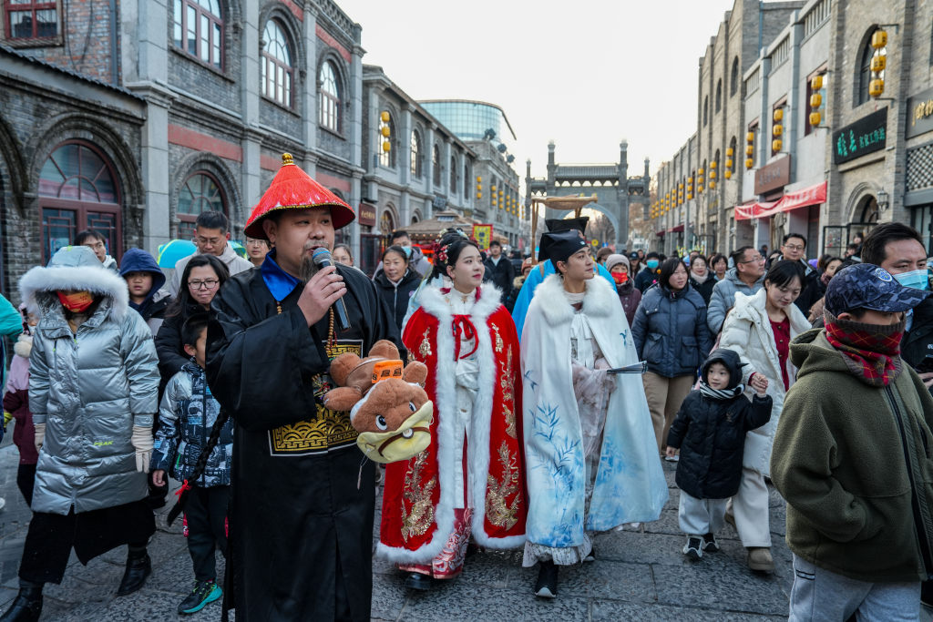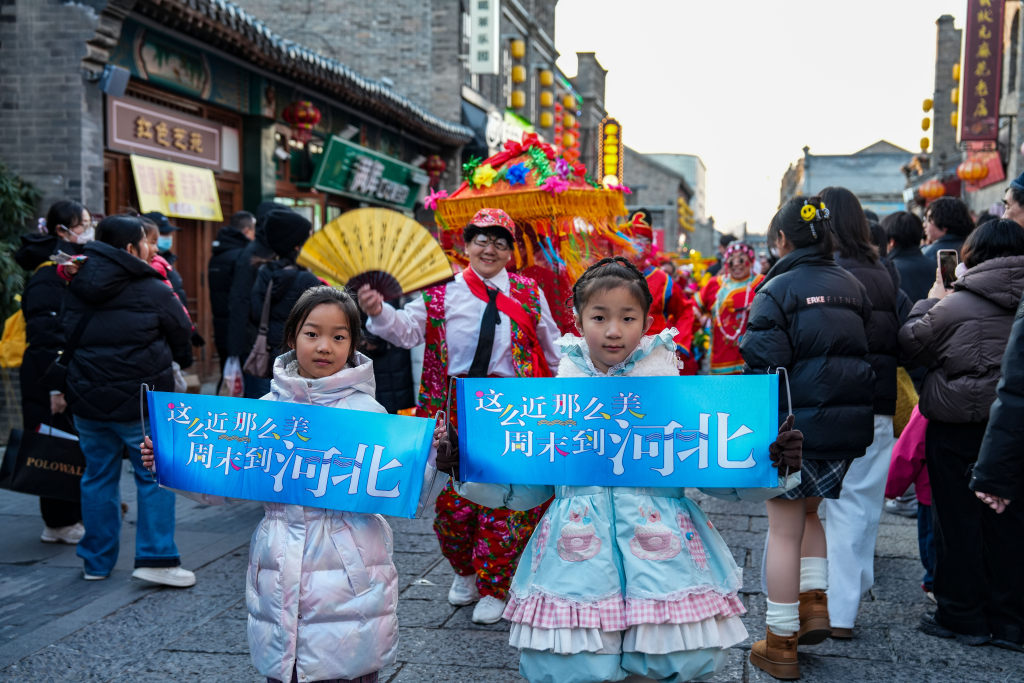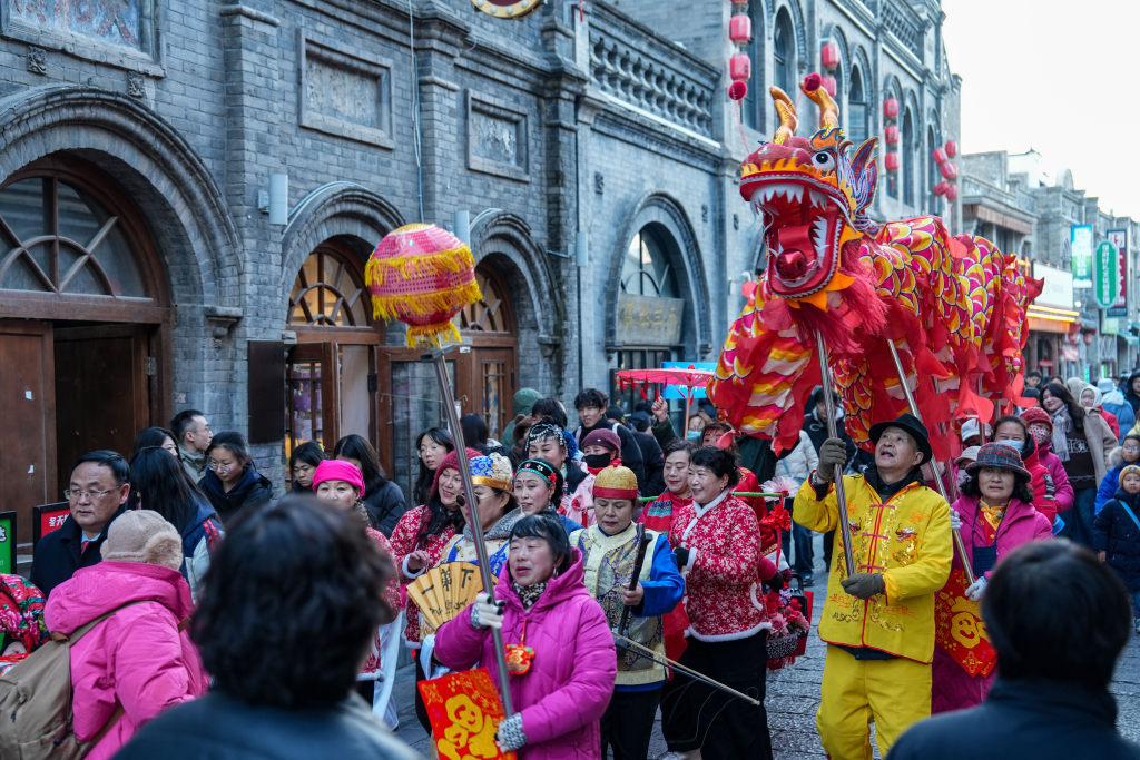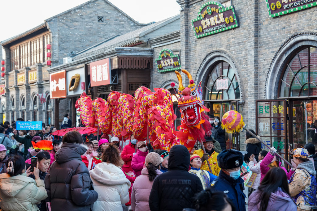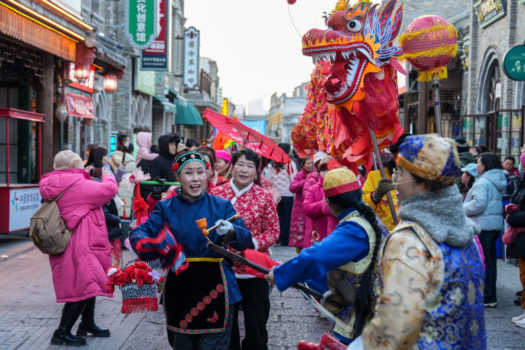 1月1日,保定西大街上演舞龙与秧歌巡游,精彩的民俗表演吸引众多游客驻足观看。