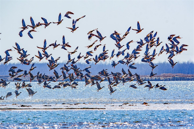七里海潟湖湖面上群鸟飞舞