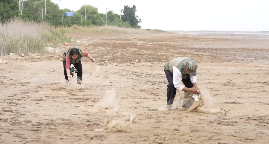 费明健和老伴儿刘桂琴在湿地旁捡拾垃圾