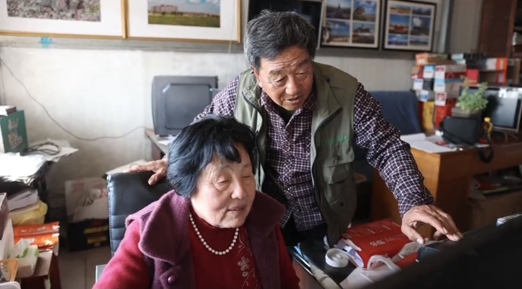 费明健和老伴儿刘桂琴在为拍摄的鸟类照片整理、归档
