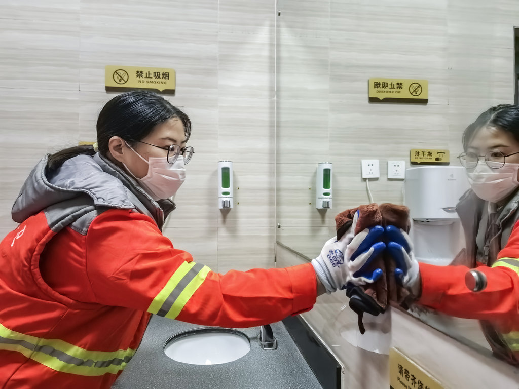 1月2日,石家庄市新华区卫生队的环卫工人对街边公厕进行清扫保洁作业。