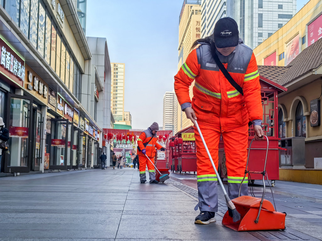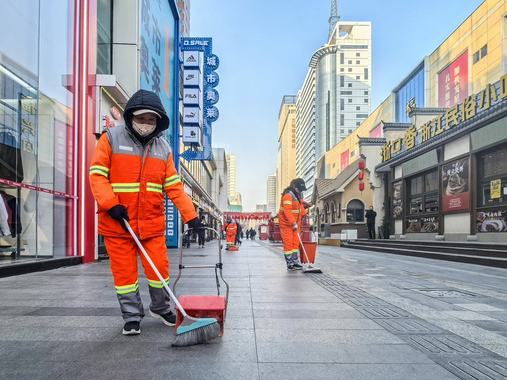 1月2日,石家庄市新华区卫生队的环卫工人在湾里庙步行街进行清扫保洁作业。